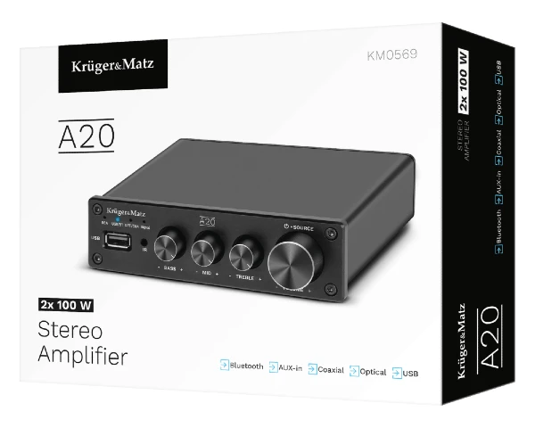 Wzmacniacz stereo marki Kruger&Matz to klucz do pełni dźwięku i doskonałego doznania muzycznego. Wyjątkowa moc, precyzja brzmienia i elegancki design sprawiają, że wzmacniacz A20 wyróżnia się w świecie audiofilskich doświadczeń.