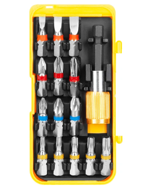 Zestaw zawiera 14 różnych końcówek bitowych ze stali chromowo-wanadowej, co pozwala na pracę z różnymi rodzajami śrub, wkrętów i elementów montażowych. Dzięki temu narzędzie to jest wszechstronne i przydatne w wielu sytuacjach.