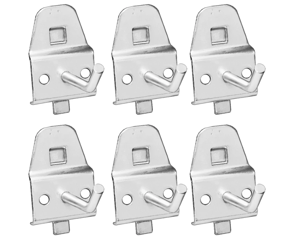 Zestaw 6 sztuk pojedynczych małych haków do zaczepienia na metalowych ściennych tablicach narzędziowych. Służyć do zawieszenia narzędzi, części i innych niezbędnych przedmiotów.