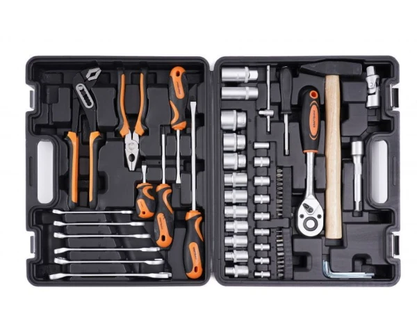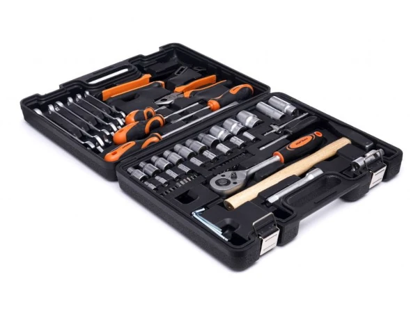 Cały zestaw składa się z 66 różnych elementów, które zapewnią odpowiedni dobór narzędzia do potrzeb. Narzędzia wykonane są z utwardzanej stali chromowo-wanadowej (CrV) przeznaczonej dla narzędzi warsztatowych.